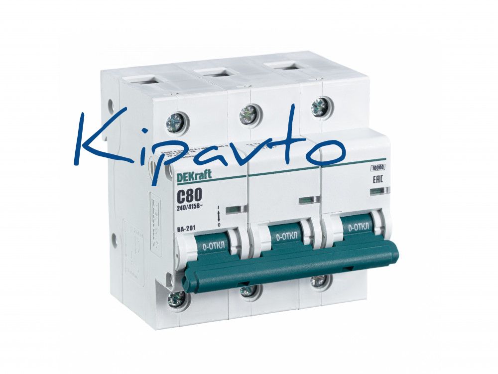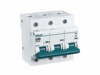Автоматический выключатель серии ВА-201 DEKraft, 3P, номинальный ток 80 А, характеристика С, отключающая способность 10 кА, ширина - 4, 5 мод. х 18мм. Монолитная лицевая панель обеспечивает безопасную эксплуатацию аппарата. Окошко-индикатор всегда показывает состояние аппарата вне зависимости от положения рукоятки управления. Двухпозиционная защелка облегчает монтаж выключателя. Клеммы рассчитаны на подключение проводников сечением до 35 кв. мм.