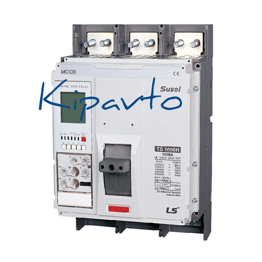 Силовой 3 полюсный автоматический выключатель переменного тока в литом корпусе на номинальный ток 1600 А, с электронным расцепителем с отключающей способностью 50кА. Трехполюсные автоматические выключатели LS Electric типа Susol TS предназначены для применения в электрических цепях с напряжением 690 В переменного тока частотой 50 гЦ, их защиты от токов короткого замыкания, токов перегрузки, а также для нечастых оперативных включений и отключений.