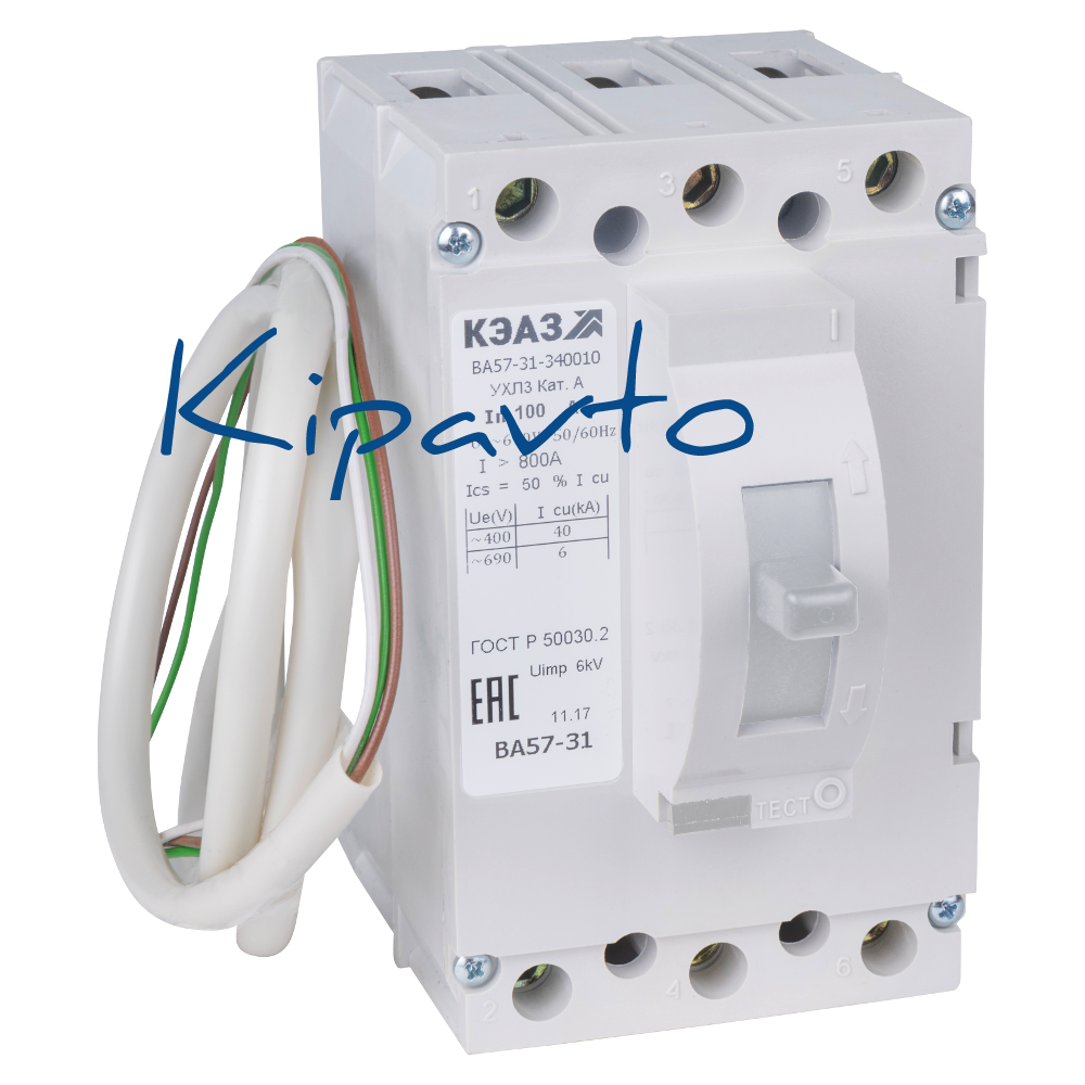 Силовой 3 полюсный автоматический выключатель переменного тока в литом корпусе на номинальный ток 50 А. Трехполюсные автоматические выключатели КЭАЗ типа ВА 57-31 предназначены для применения в электрических цепях с напряжением до 220 постоянного / 690 В переменного тока частотой 50 и 60 Гц, их защиты от токов короткого замыкания, токов перегрузки, проведения тока в нормальном режиме и нечастых оперативных включений и отключений.
