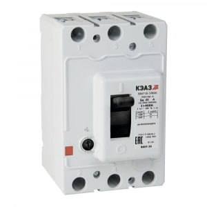 Силовой 3 полюсный автоматический выключатель переменного тока в литом корпусе на номинальный ток 63 А. Трехполюсные автоматические выключатели КЭАЗ типа ВА57-35 предназначены для применения в электрических цепях с напряжением 400 / 690 В переменного тока частотой 50 и 60 Гц и 440В постоянного тока, их защиты от токов короткого замыкания, токов перегрузки, недопустимых снижений напряжения, а также для нечастых оперативных включений и отключений.