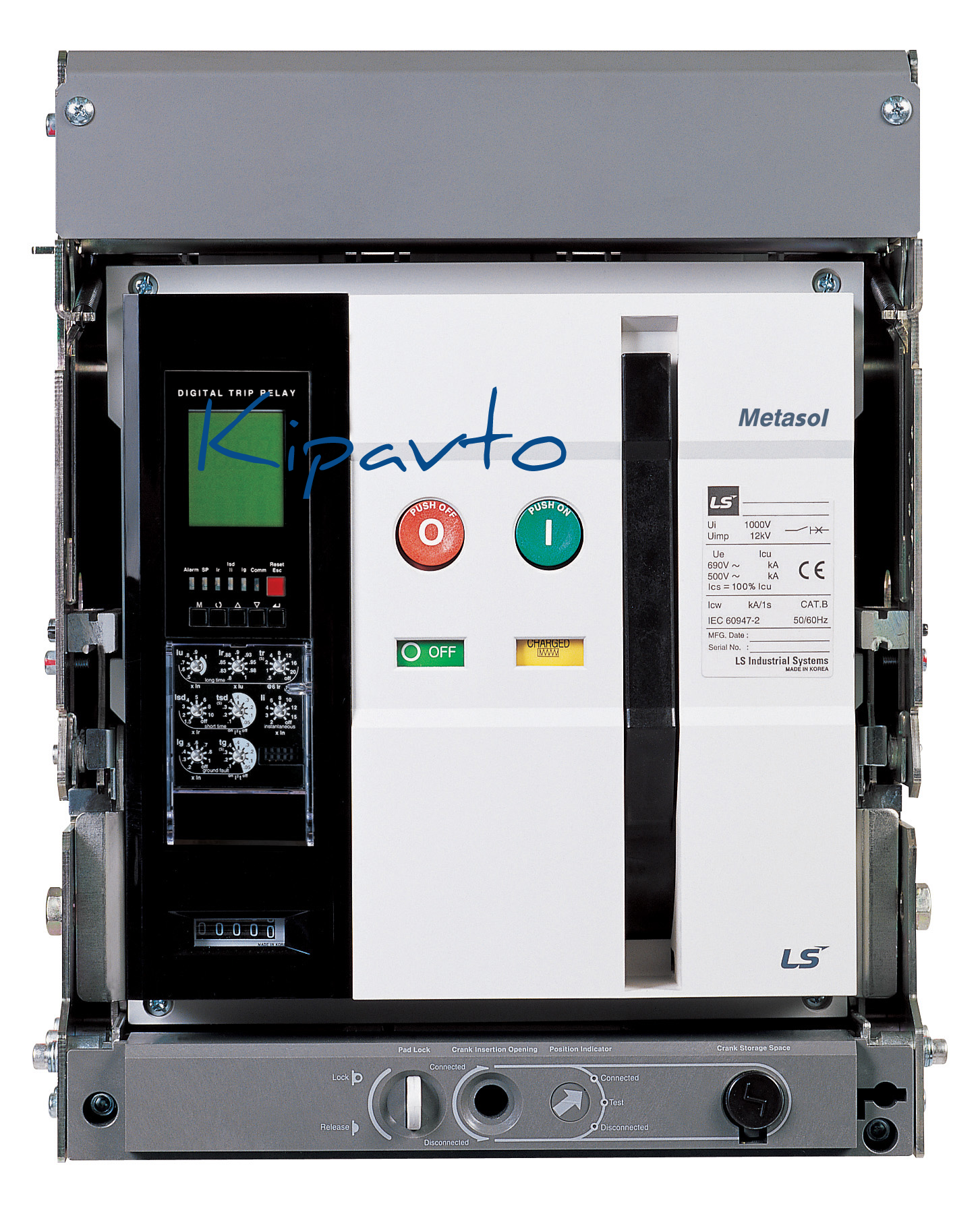 Силовой 3 полюсный воздушный автоматический выключатель переменного тока в выкатном исполнении на номинальный ток 800 А, с электронным расцепителем (AC6), мотор-приводом, катушкой включения, независимым расцепителем. Корзина заказывается отдельно. Выключатель имеет номинальную отключающую способность 65 кА. Трехполюсные автоматические выключатели LS Electric типа Metasol предназначены для применения в электрических цепях с напряжением 690 В переменного тока частотой 50 гЦ, их защиты от токов короткого замыкания, токов перегрузки, а также для нечастых оперативных включений и отключений.