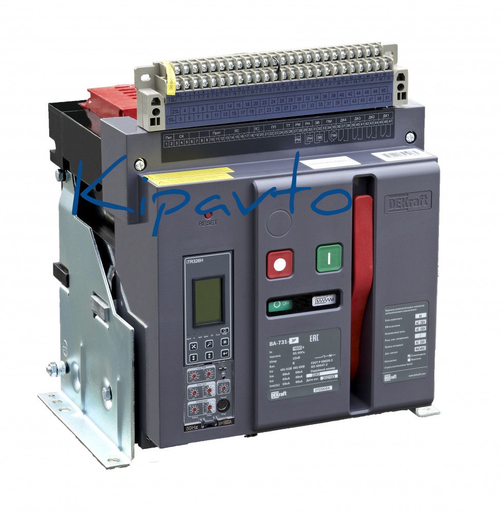 Воздушный автоматический выключатель серии ВА-731 DEKraft - 3P, номинальный ток 1600 А - отключающая способность 80 кА, стационарный, блок управления типа H - присоединения задние горизонтальные. В базовую комплектацию входят моторный привод (230 В пер.тока), 4 контакта состояния ВКЛ/ОТКЛ, сигнальный контакт, электромагнит включения (230 В пер.тока), независимый расцепитель (230 В пер.тока), разделители полюсов и рамка передней панели. Выключатели с блоком управления типа H позволяют осуществлять мониторинг и диспетчеризацию защищаемой сети и нагрузок.