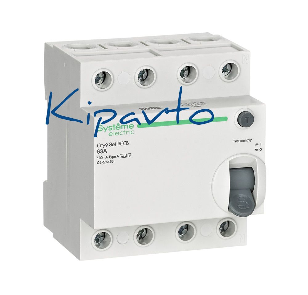 Выключатель дифференциального тока (ВДТ) или устройство защитного отключения (УЗО) серии City9 Set Systeme Electric, селективный, 4-полюсный, номинальный ток 63А, ток утечки 100 мА, тип А, электромеханический. Применяется в электрических сетях напряжением 400В. ВДТ типа S устанавливается на вводе и служит для обеспечения полной селективности благодаря задержке срабатывания. Кнопка тест обеспечивает проверку работоспособности аппарата. Крепление на DIN-рейку шириной 35 мм. Подключение сверху и снизу. Безопасные клеммы с защитой от неправильного подключения.