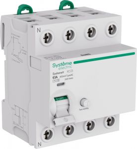 Выключатель дифференциального тока (ВДТ) или устройство защитного отключения (УЗО) S9R, серии Systeme9, Systeme Electric, 4-полюсный, номинальный ток 63 А, ток утечки - 300 мА, тип AC S. Соответствует требованиям стандартов ГОСТ IEC 61008-1 и ГОСТ IEC 60947-2. Применяется в электрических сетях напряжением 400 В. Предназначен для защиты людей от токов утечки при прямом (10 и 30мА) и косвенном (100мА) прикосновении к токоведущим частям, а также для защиты электроустановок от возгорания (300мА). Принцип действия - электромеханический. Нейтраль слева. Оснащен двойными безопасными клеммами раздельного монтажа проводников, механизмом мгновенной коммутации, индикатором состояния контактной группы и срабатывания по причине возникновения тока утечки. Монтируется на DIN-рейку при помощи двухпозиционных защёлок, с возможностью демонтажа без снятия шины PIN.