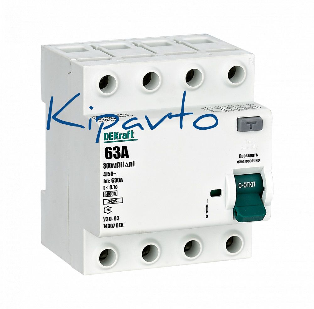 Выключатель дифференциального тока (ВДТ) серии УЗО-03 Dekraft, 4P, номинальный ток 63А, номинальный дифференциальный ток 300 мА, блок дифференциальной защиты – электромеханический, тип дифференциального расцепителя - A, ширина – 2 мод. х 18 мм, монтаж – на 35 мм DIN-рейку. Уставка тока утечки 300 мА обеспечивает защиты людей от поражения электрическим током при косвенном прикосновении, сборки от возгорания из-за тока утечки. Электромеханический выключатель дифференциального тока (ВДТ) разомкнет цепь даже при повреждении «нулевого» провода либо значительном падении напряжения. При сборке выключатель дифференциального тока (ВДТ) и автоматический выключатель (ВА) для его защиты устанавливаются последовательно, номинальный ток УЗО-03 NEW 6кА должен быть равен номинальному току автоматического выключателя (ВА).