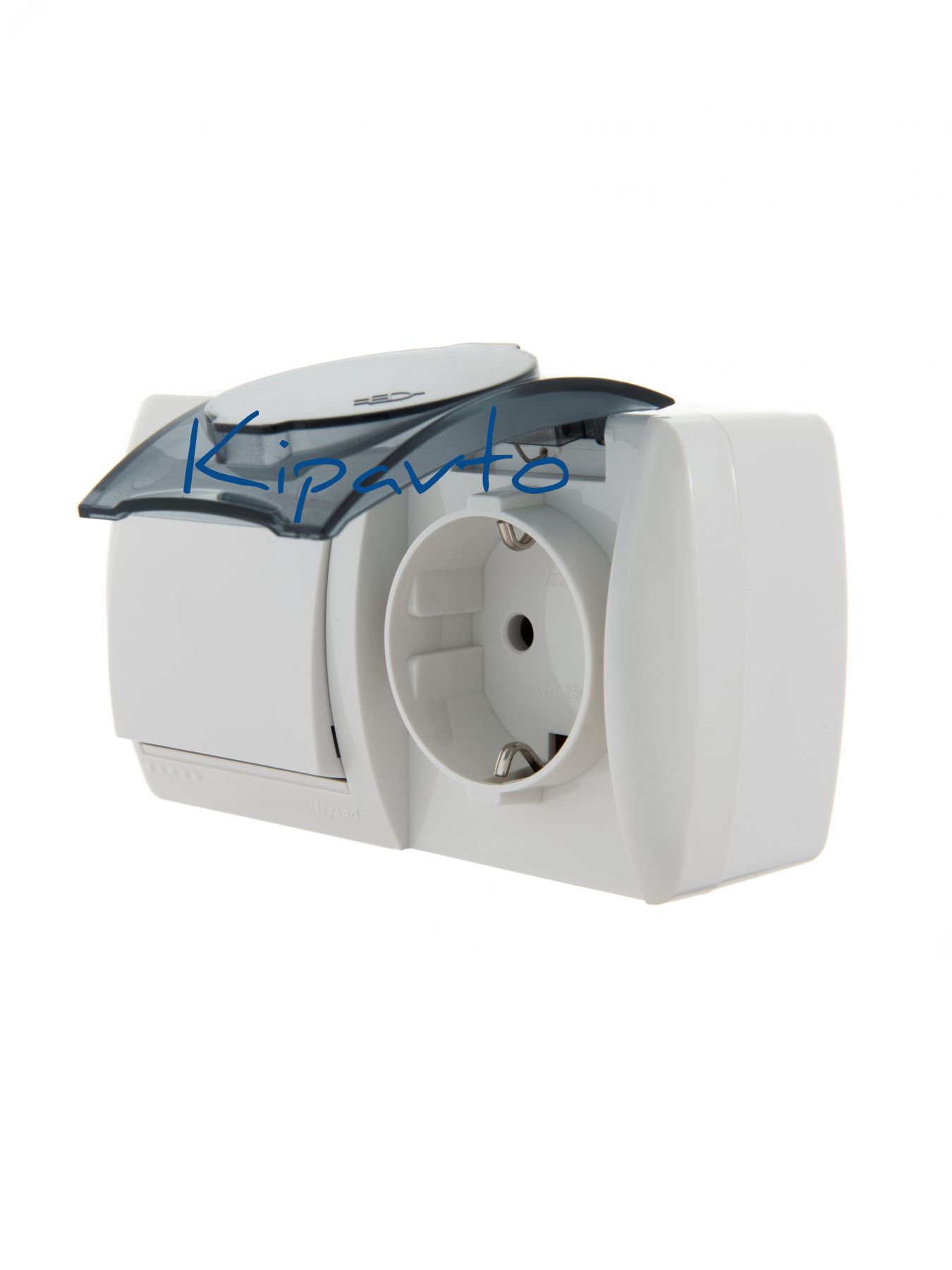 Выключатель одноклавишный, с розеткой с заземлением крышкой, белый, горизонтальный