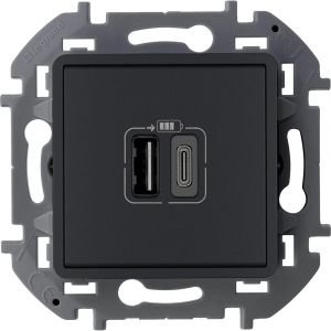 Зарядное устройство Inspiria для скрытого монтажа , тип А-тип С, цвет ''Антрацит''. Напряжение ~240В/-5В, максимальный зарядный ток 3000 мА. Применяется для непосредственной зарядки одного или двух мобильных устройств.